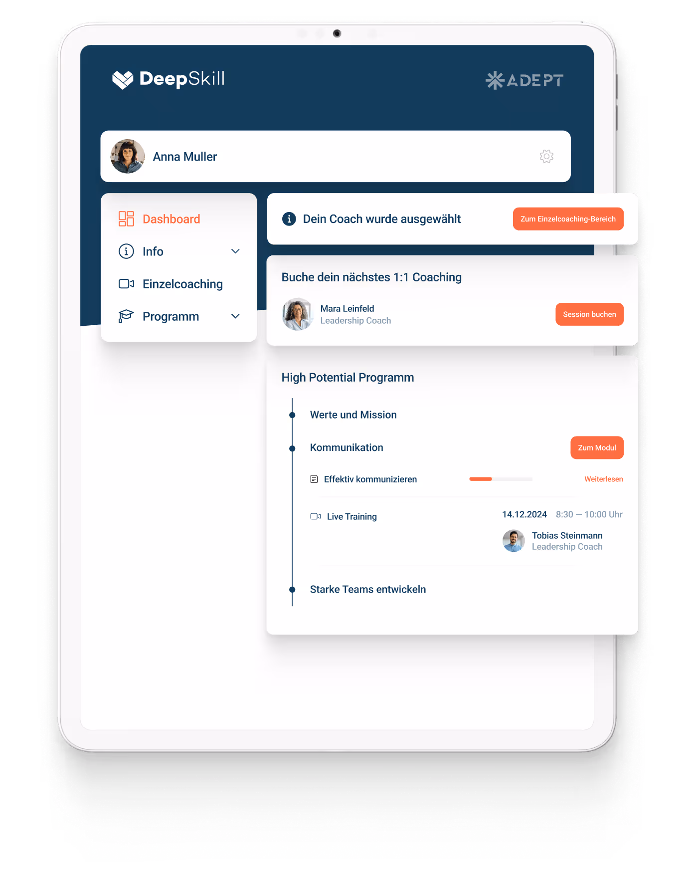 Unterstützt von unseren KI-Algorithmen passen wir die ausgewählten Skills, Inhalte und Coaches auf eure strategischen Vorhaben an.